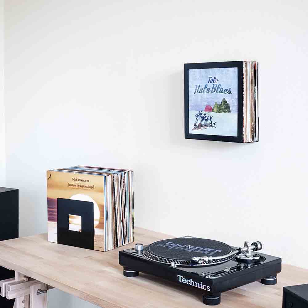 The uniquely designed storage boxes can hold up to 90 records on a table, shelf or mounted on a wall.